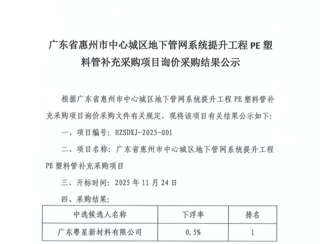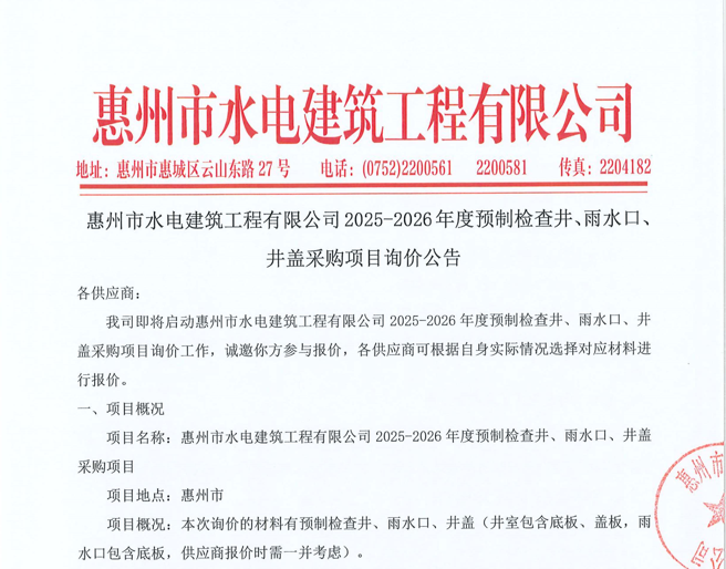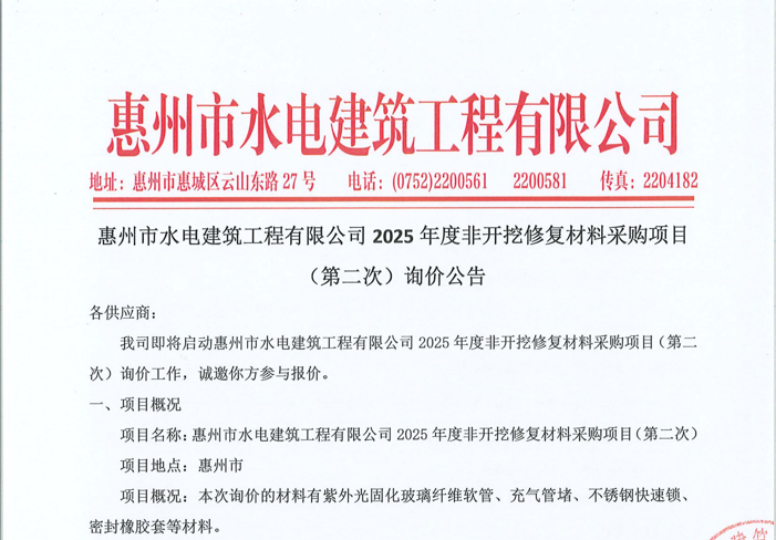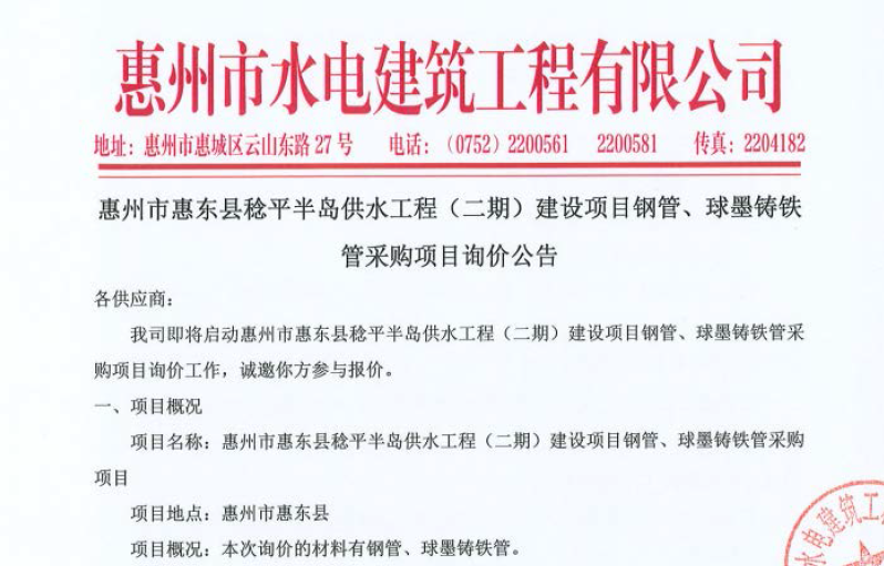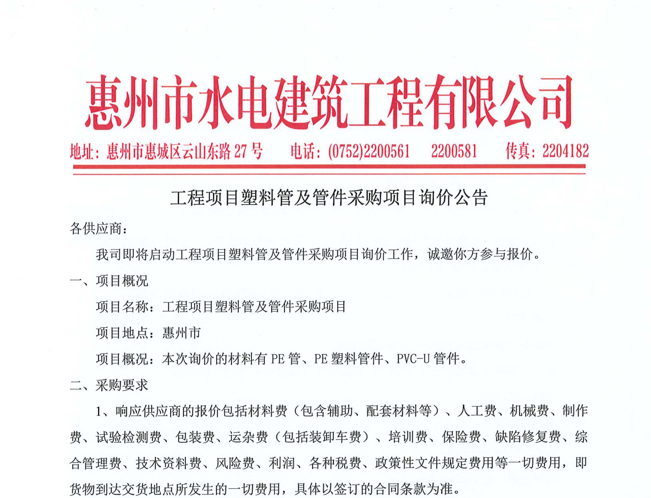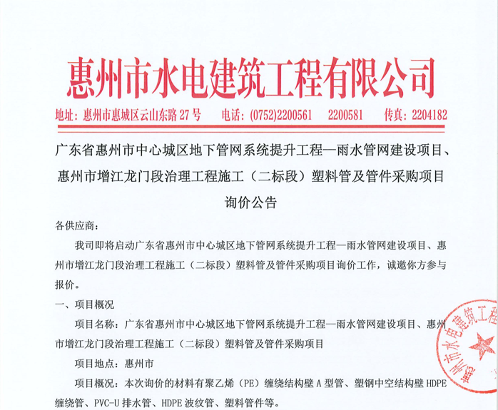 廣東省惠州市中心城區(qū)地下管網(wǎng)系統(tǒng)提升工程—雨水管網(wǎng)建設(shè)項目、惠州市增江龍門段治理工程施工(二標段)塑料管及管件采購項目詢價公告……